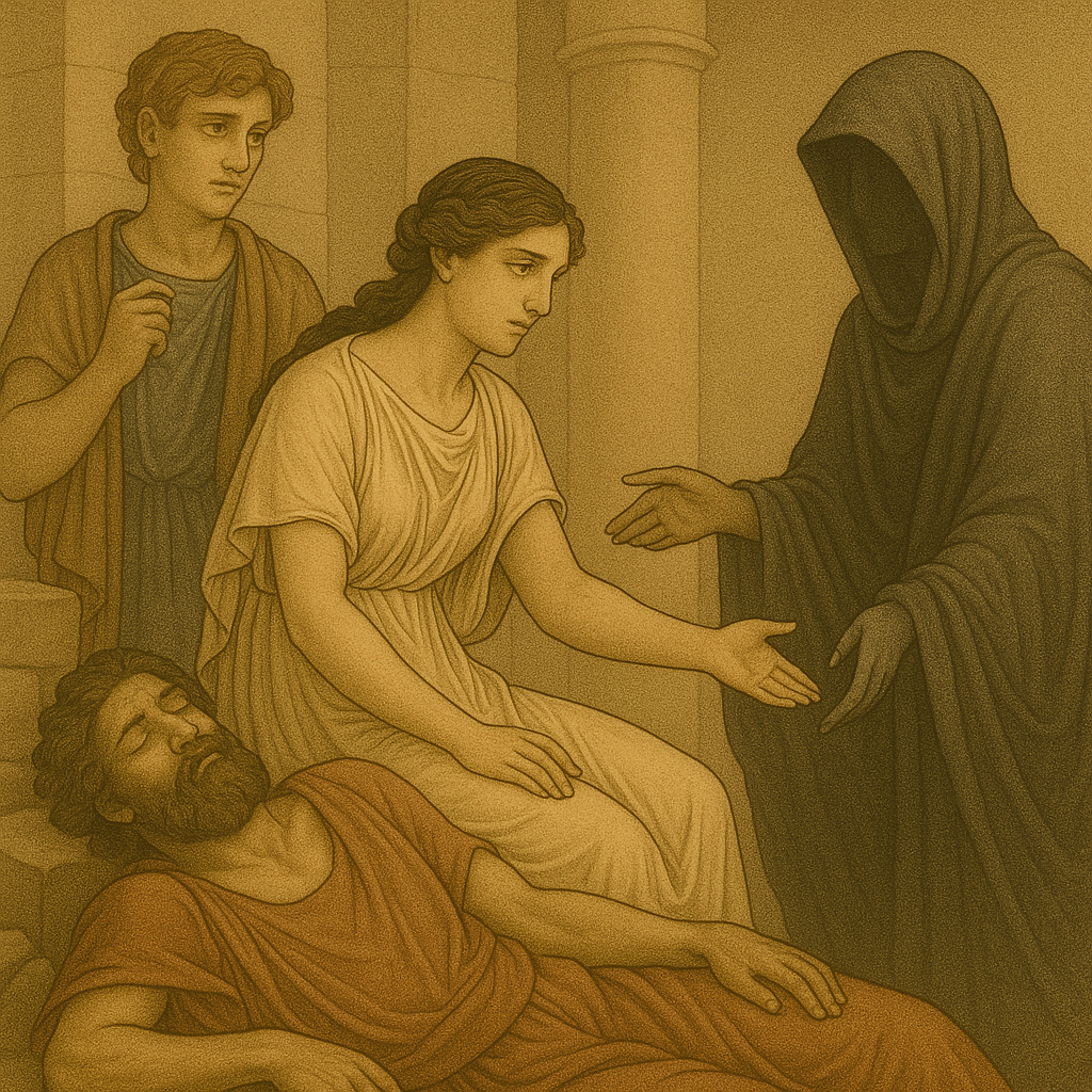 La scena è una delle più commoventi del teatro antico: Alcesti muore tra le braccia del marito, e la casa di Admeto si riempie di lutto e rimorso.
